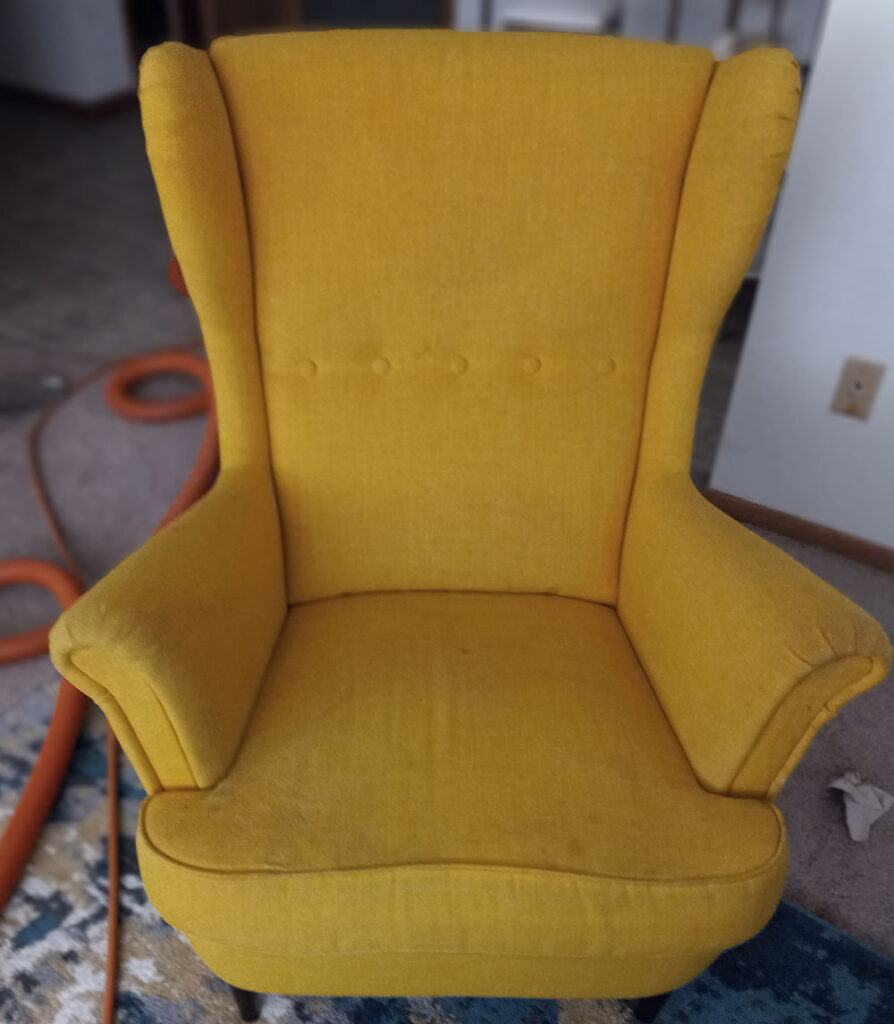 Check out this before and after, a gold chair has spots, stains and uneven appearance. Our upholstery cleaning in the after photo: all stains gone, and nice even appearance! Don't throw that chair out! Call us today and ask about the great reasonable pricing and see these fantastic results for yourself. Call today!